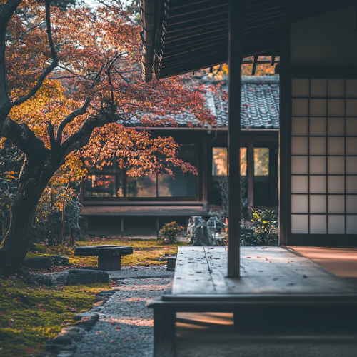 modest architectural photorealistic image of a traditional japanese Minka, autumn day in japan, Sony Alpha 7R V, 35mm lens, f/16, soft natural light on a cool japanese day, deep depth of field, subdued colors, ISO 250, 1/60 sec --style raw --stylize 30 --v 6.1