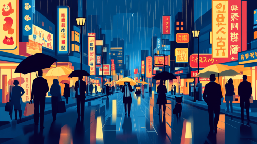 Create a Disney Pixar-style illustration of a nighttime commuting path in Japan. The scene should feature bustling city streets lined with traditional and modern buildings, illuminated by soft streetlights and vibrant neon signs. Include diverse commuters, dressed in business attire, walking with umbrellas in the gentle rain, and capturing the atmosphere of urban life. The sky should be a deep navy blue with scattered clouds and a hint of stars. Add whimsical elements, like playful shadows on the pavement and animated cats peeking from alleyways, to create a warm and inviting atmosphere. The aspect ratio should be 16:9 to give a cinematic view of this enchanting nighttime scene --ar 16:9