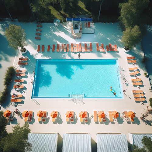 photograph, drone shot, wideangle, 24mm, top view, swimming pool, 2 sun loungers, clean ceiling, springboard, analog film, colorful, kodak, sixties ar16:9