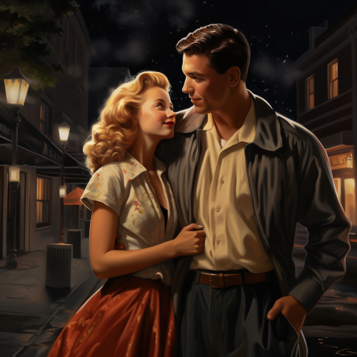 a photorealistic 20th century couple happily walking down a small town street at night