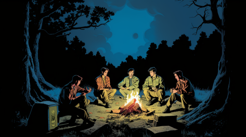 A band of travelers sat around a campfire telling stories at night under the moonlight. Comic book Steve Ditko Style. --ar 16:9