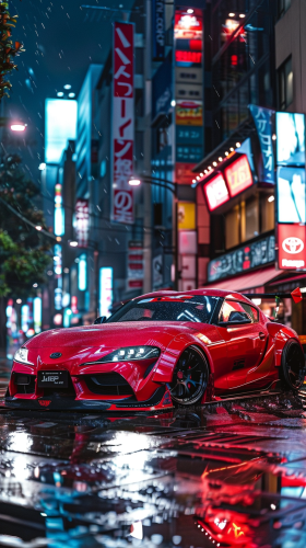 Toyota supra MK4 front side view, Custom widebody, RED metallic, black wheels, JDM style decals on a wet street in downtown Tokyo at night,Background is nicly lens blur and perfect color balance --ar 9:16 --v 6.0
