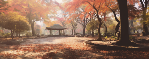 autumn colors in a beautiful tokyo park, warm autumn colors, photographic realism, koyo colors, autum leaves, warm colors, photorealistic, warm sunlight --ar 5:2
