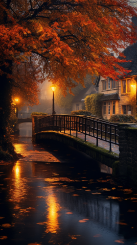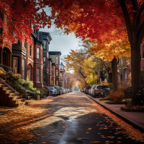 A picturesque autumn street scene in a small town, with rows of trees glowing in rich red, orange, and yellow tones, shedding leaves that fall gracefully to the ground. Porches feature pumpkins, hay bales, and rustic decor, creating a cozy ambiance. Soft fog lingers, enhanced by the warm glow of the setting sun filtering through branches. Shot with a Canon EOS R5 and a 35mm lens, this image captures deep textures and a moody, cinematic atmosphere.