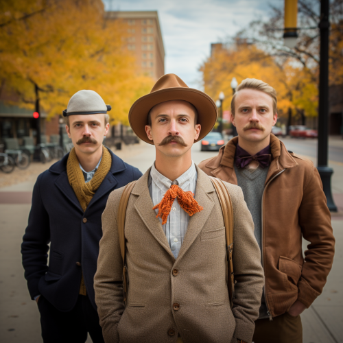 A warm, cinematic photograph of a cozy small-town street lined with towering autumn trees in vibrant shades of red, orange, and yellow. Leaves gently drift down in the soft evening air, creating a colorful carpet along the sidewalk. Rustic decorations and pumpkins adorn each porch, with a slight mist in the air adding to the nostalgic feel. Captured with a Nikon D850 and a 50mm lens, this scene glows with warm, golden light, invoking a sense of peaceful autumn nostalgia.