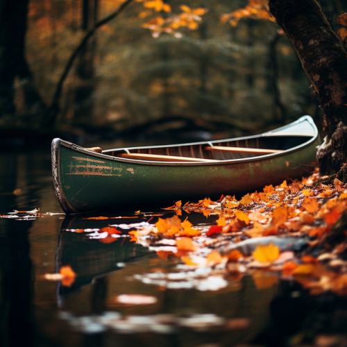 Professional editorial photography - colored leaves gleam off water and green canoe, during autumn in the carolina mountains, vintage luxury home, deep colors and contrast, nostalgia, wet outside, glowing orange inside, warm and inviting atmostphere, green undertones
