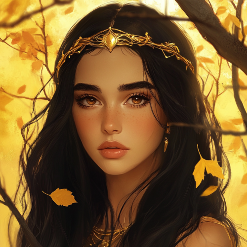 fantasy young woman with long black hair, with slightly highlighted brown eyes, with a golden headband and wearing golden Egyptian jewelry autumnal environment, flanked by branches with yellow leaves on a yellow abstract background --v 6.1