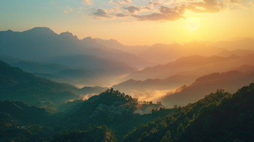 cinematic scene, wide shot, bird’s eye angle, golden hour, mountains, with a lot of fog between mountains, Canon EOS 5D Mark IV, --ar 16:9 --style raw --v 6.0