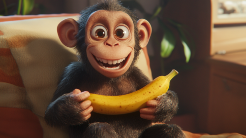 Banjo a monkey nibbling on a banana promises to behave (mostly) though a hint of mischief in a living room still lingers in his grin ultra-realistic animated. --ar 16:9