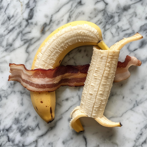 of photo of a partially peeled banana with a slice of bacon wrapped around the unpeeled portion.