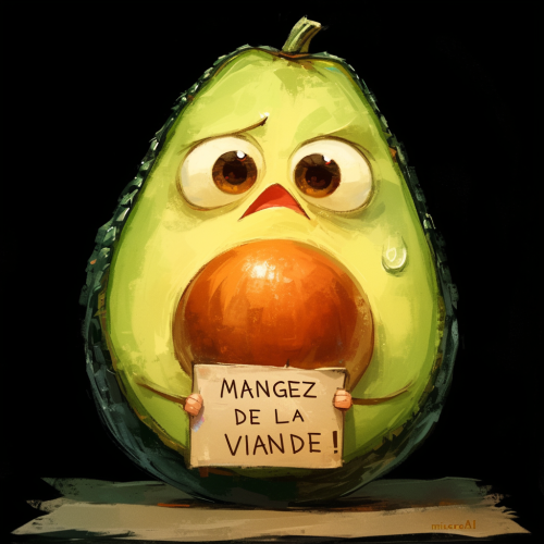 isolated on black background, an angry avocado holding a sign "MANGEZ DE LA VIANDE !", the avocado shows its its angry tongue, extraordinary & funny pixar style, isolated on black background. art by mierAI --ar 1:1 --stylize 1000 --niji 6
