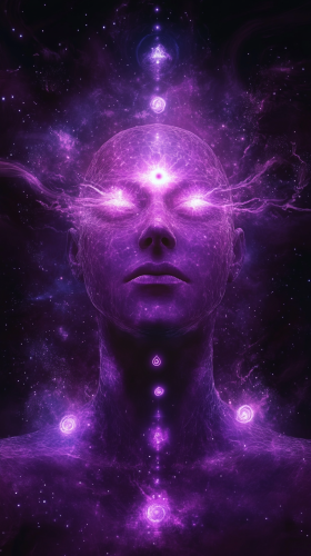 A glowing purple humanoid figure sits in a meditative posture, radiating an intense, ethereal light. The figure’s third eye is prominently glowing on its forehead, symbolizing the awakening and power of intuition. Streams of radiant energy flow from the third eye, connecting to cosmic elements above, such as swirling stars, galaxies, and ethereal light patterns. The surrounding atmosphere is filled with mystical energy waves and shimmering particles, emphasizing the powerful spiritual connection. The background is a dark, starry expanse, enhancing the sense of a deep, intuitive awakening and spiritual enlightenment. --ar 9:16 --s 750