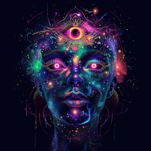 Abstract surreal digital art of woman's face with third eye in neon colors high contrast black background
