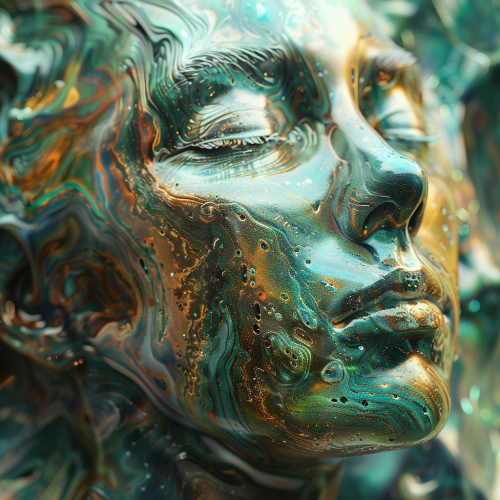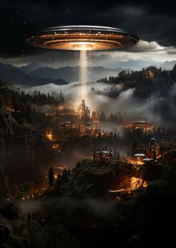 An auriferous medieval Light and spiritual awakening image with UFO, Dendritic Agate, medieval style, and a Serene view --v 5.2 --c 15 --ar 5:7 --s 750