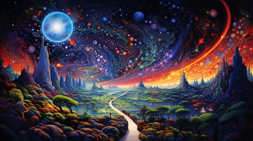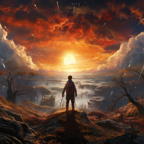 color epic cinematograph of a person discovering their purpose in life, enlightened, excited, smiling, indicating spiritual awakening, Hosoda Mamoru style drawing, creative, spirituality, awakening, enlightenment, purpose, dreams, dramatic wideshot --ar 9:16 --c 80 --s 1000