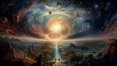 A colorful heavenly realm in bright blue and cream color with golden colored clouds, human shaped colored in glory shining brightly floating in the space towards an exceedingly shining bright light