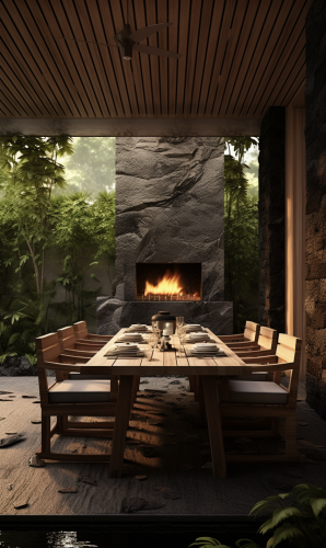 award winning design render of the exterior dining space in a garden, garden has fire pit on he side. covered and uncovered areas. Singapore style, Modern 80%, Southeast Asia 20% style and mixed with wabi sabi, clean lines are simple. And there is a mixture of natural materials, wood, stone. These materials are not only beautiful. It also helps create a connection between your home and the natural environment. and have adequate ventilation. tropical, high end, indoor outdoor area and a well-designed roof to keep out the sun and rain, and accentuate bright and bold décor items such as cushions or artwork to add visual interest to the space. ,The house is in Phuket Thailand, 4k, reality. hyper-realistic. extreme detailed --ar 9:15