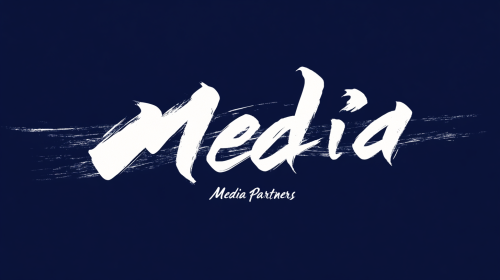 Modern Japanese-inspired logo for "Media Partners," displayed in a powerful, bold white brush script against a solid deep navy blue background. The script is large, dynamic, and executed with sumi-e style brushstrokes to convey depth and a strong visual impact. A minimalist yet striking composition. Created Using: calligraphic brush techniques, vector design, minimalist aesthetics, high color contrast, fluid brush textures, Japanese ink art influence, digital graphic design, hd clarity --ar 16:9 --v 6.1