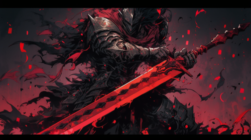 A warrior on his knees with a big sword, bodybuilder build, dead demons around him, black background, use only black, red and white colors, monochromatic chaos, distorted realism, intense close-up, full HD 24K, sharp on details --ar 16:9 --niji 5 --s 250