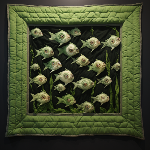 A hand made quilt depicting a green window with 20 fish headed babies looking through