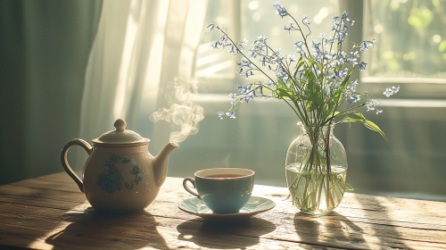 A cozy scene for March: a steaming cup of tea on a wooden table, a charming teapot beside it, and a vase filled with delicate bluebell flowers. Soft sunlight filters through a window, creating a warm and inviting atmosphere, with gentle spring colors. --q 2 --ar 16:9