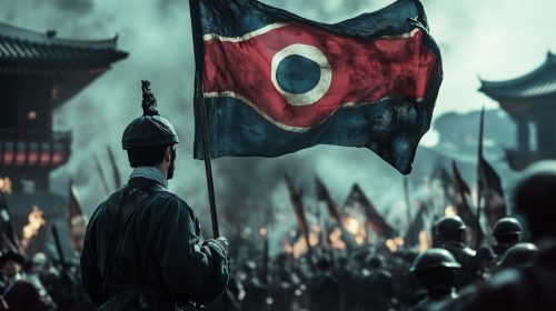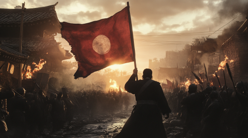 John Wick during the March 1, 1919, movement in Korea, South Korea, raising the flag,Taegeukgi, Korean flag, the national flag of Korea, peaceful protest, realistic photography, press photo, high definition, 8K, graphics, cinematic --ar 16:9