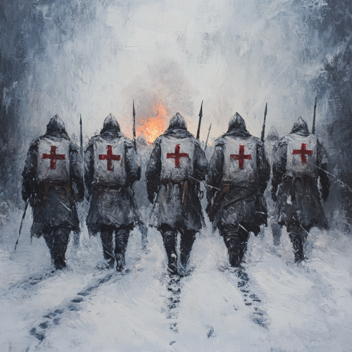 Templar Knights marching in a group through the snow. Their boots leave footprints in the snow. There is frost in the air. Inside them glows a fire. They walk with grace despite the cold. One knight whispers into the cold and his breath is seen as mist. Make the image vast and atmospheric and painted in loose brush strokes in traditional oil. Make the knights red crosses stand out.
