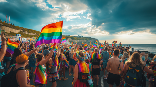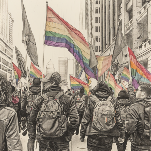 graphite detailed artwork of a lgbtq protest for rights in style of artist Egon Schiele, include rainbow flags