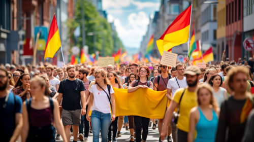 people in a large climate protest. peaceful atmosphere. summer. germany. --ar 16:9 --style raw