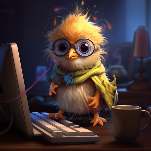 a guy sitting on his gaming chair playing his computer, 90's retrofuturism, colorful, the guy has a bird standing on his head, ultra realistic, realism