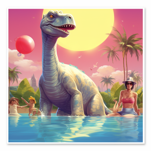 Sticker, please Illustration an Argentinosaurus as a lifeguard, keeping watch over a dino pool party., VERY high detail, photorealistic, cinematic, very positive, very friendly, VERY high color, Pixar style, a white background --ar 1:1 --v 5.2