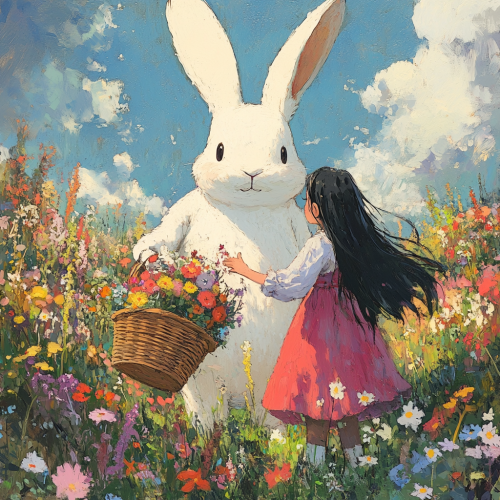 large white rabbit holding a basket of flowers and holding hands with a young indonesian girl with long dark hair, both standing in a field of flowers studio ghibli style