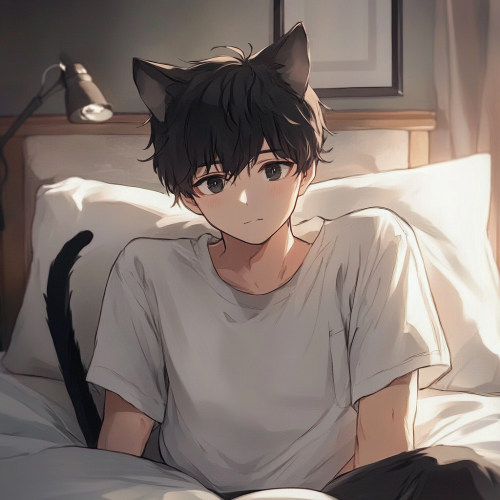 Catboy in a bedroom wearing an oversized white t-shirt, with cat ears, cat tail, bowl cut, black hair, black eyes, pale skin, sitting in a bed hugging a white pillow, ((detailed)), ((best quality)), ((high quality)), ((bedroom background)), ((masculine cute face)), ((perfect)), ((handsome)), ((kemonomimi)), ((bowl shape hair)), ((hime cut)), ((perfect body)), ((perfect hands)), ((perfect head)), ((very detailed)), ((high resolution)), ((cinematographic)), manhwa: Black Corporation: Joseon
