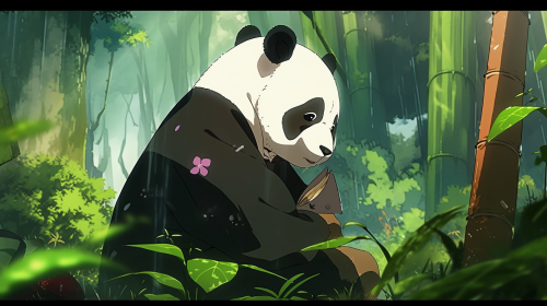 [e944fbda7] Cute female panda with very shy expression. Third perspective in the bamboo forest. --niji 5 --ar 16:9 --c 0