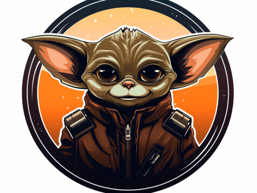 black and white vector logo of Baby Yoda with cat's eyes and a mischievous smile, wearing a leather jacket, and positioned in a 3/4 view, head cocked to the side. Place the subject inside a circular frame, 2d illustration, in the style of Felicia Chiao, black on a white background, --ar 4:3