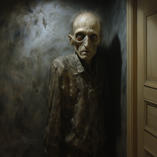 Create an illustration in the style of Edward Gorey, featuring two figures in an intimate, almost ceremonial pose. One character wears dark, intricately patterned garments, adorned with tattoos and metallic accents, while the other is dressed in minimalist white, with sleek and elegant lines. Use cross-hatching extensively to render shadows and textures, emphasizing the contrast between their outfits. Their expressions should remain neutral, evoking a sense of detachment and quiet mystery. Keep the background minimal, using negative space effectively to enhance the focus on the figures. Introduce subtle symbolic elements, such as geometric shapes or delicate, glowing motifs, to hint at hidden themes of unity and tension. Capture the eerie elegance and surreal atmosphere characteristic of Gorey’s work.