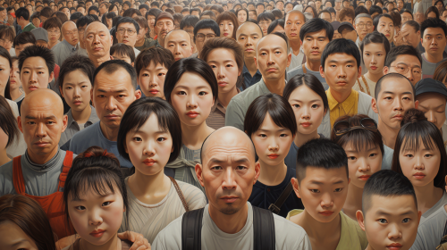 an enormous crowd of Chinese people stare back at us photorealistic --ar 16:9
