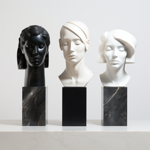 4 marble busts of 2 men and 2 women on pedestals, symetrical, sleek, modern, luxurious, black and white and grey, marble