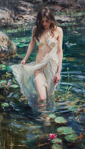 oil painting, extremely detailed brushstrokes, art deco figurative, full length portrait, beautiful woman in garden pond, only head is above water, clear water, transparent white flowing slip, in the style of John William Waterhouse --ar 4:7 --style raw --v 6.0