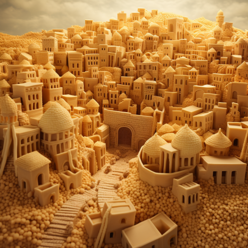 a photo of the mayor of macaroni and cheese town, wearing a yellow three piece suit, a sash, a monocle and top hat and a baton, standing in front of macaroni city hall
