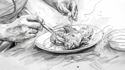 pencil sketch of a chicken tender being dipped into sauce, pencil sketch, storyboard, concept art, black and white, --ar 16:9 --v 6.0