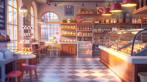 a colorful bakery kitchen with lamp, colorful light, bread, cake, birthday cake, vibrant color, saturated color scheme, blue, pink and yellow color, cute and colorful, rainbow color --ar 1:1