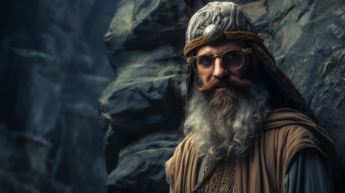 a tall bearded bald hipster wearing glasses entering helm's deep --ar 16:9
