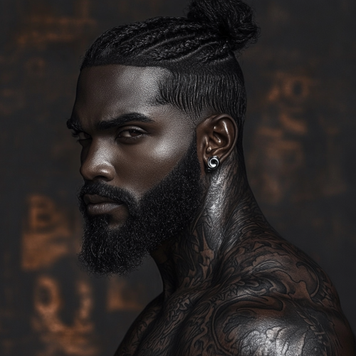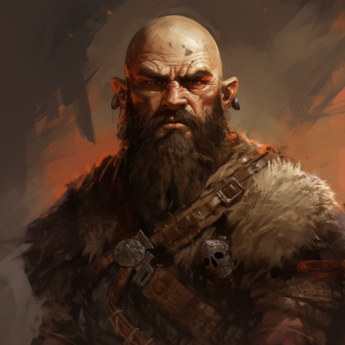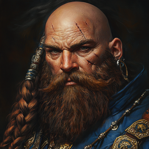 A massive dwarf who is in his late 40s. He has a long,b bushy beard that is braided and adorned with metal beads, he is bald and has battle scars. His eyes are a deep, intense brown and his expression is stern and focused. He is wearing a blue military uniform.
