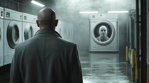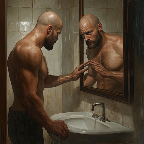 someone looking into a bathroom where a tall white man with broad shoulders, not wearing a shirt, bald with a dark brown beard and blue eyes, is looking at himself in the mirror while putting his hand on the sink