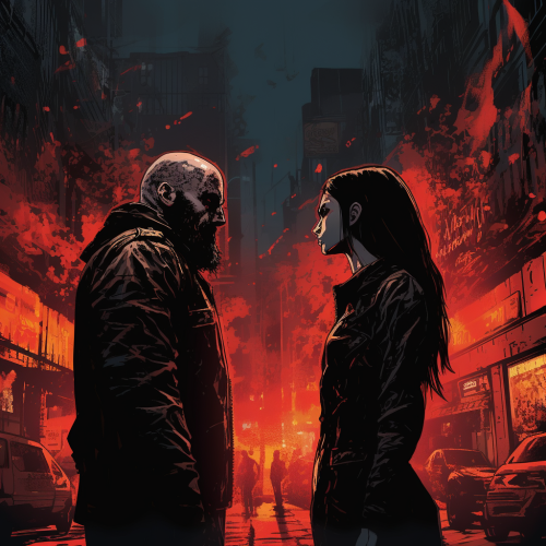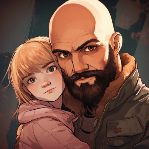 a handsome bald man with brown beard rough housing with his blond young daughter. Graphic novel.