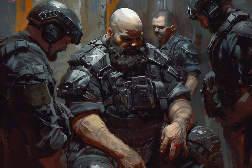 a bald slightly chubby man, black beard, interrogating a swat unit, mtg artstyle, high resolution, --ar 3:2