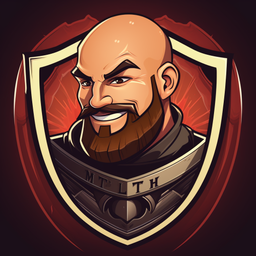 logo for a twitch channel, with a man's face of a bald man with beard, smiling, put a shield as background and remove neck and shoulders, no backgound, cartoon style