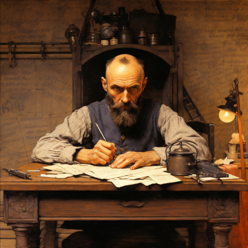 A handsome bald man with brown beard sitting at a rustic desk writing. Norman Rockwell 1920s saturday evening post cover.