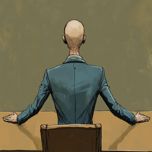 a simple cartoon drawing in the style of Krapopolis TV show, of a man from behind, he's somewhat scrawny and bald, and wearing a dark blue suit. He's sitting at a nice table with his arms out on the table.